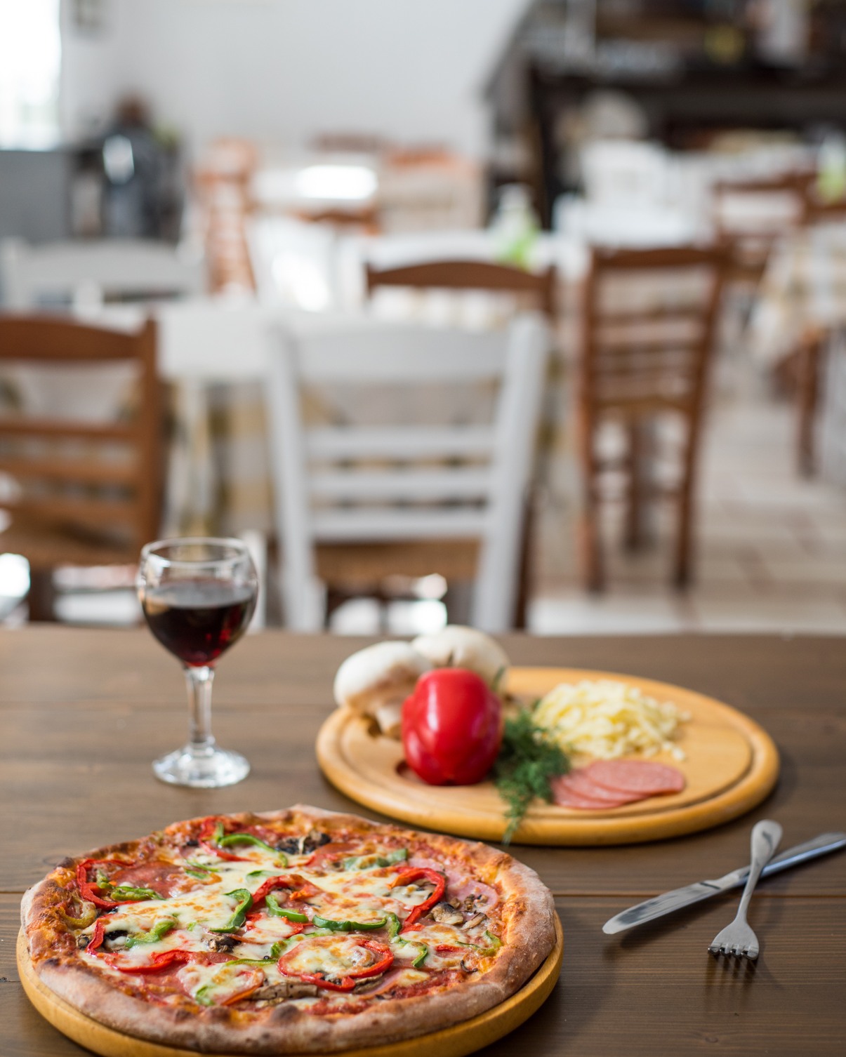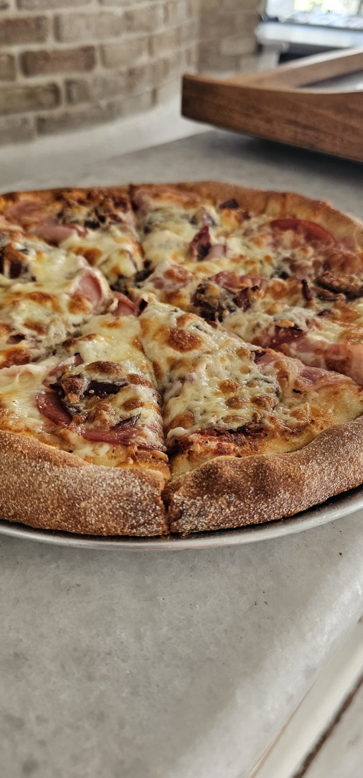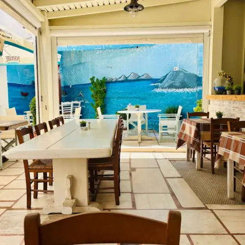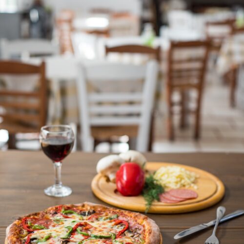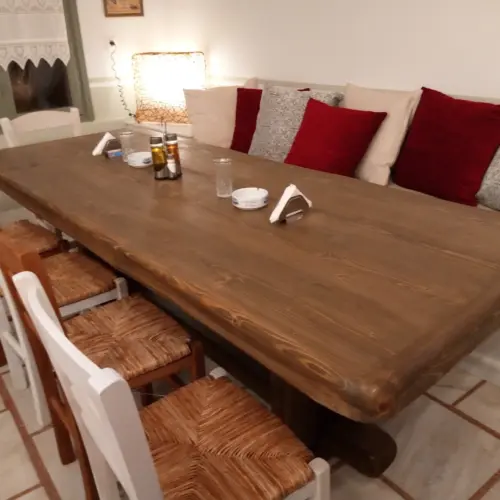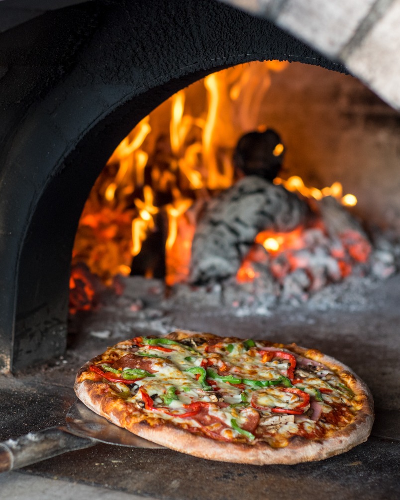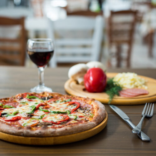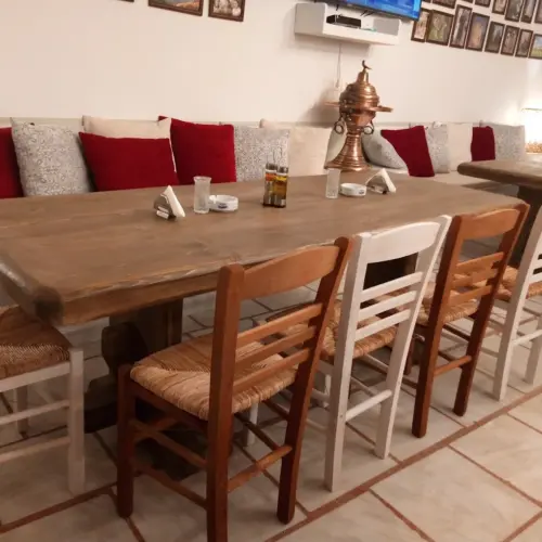 Here you can enjoy wood-fired pizzas, authentic Greek and Italian dishes, and fresh salads prepared with carefully selected local ingredients, all in a warm and welcoming atmosphere.